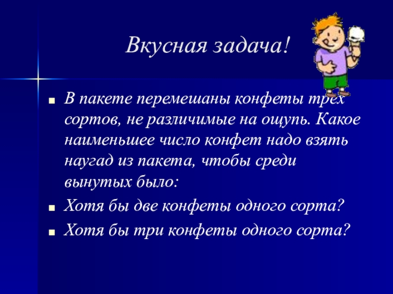 Вкусная задача! В пакете перемешаны конфеты трех сортов, не различимые на ощупь. Какое наименьшее число конфет надо