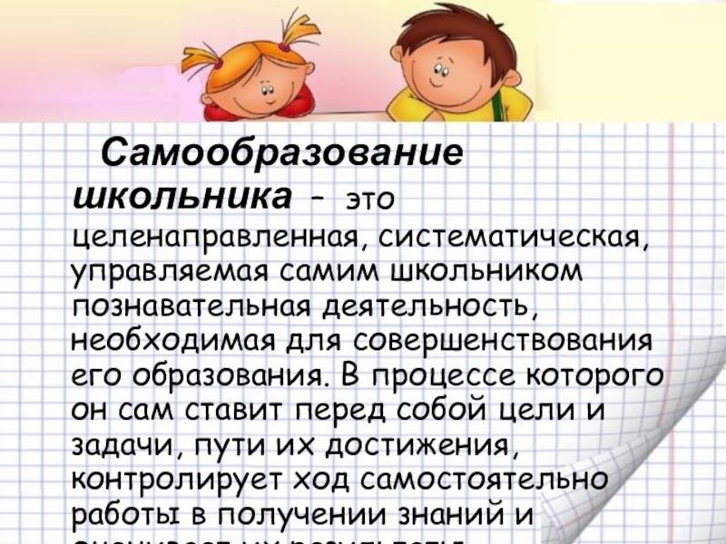 Слайд 4Самообразование школьника – это целенаправленная, систематическая, управляемая самим школьником познавательная деятельность,