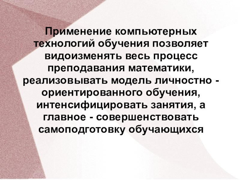 Применение компьютерных технологий обучения позволяет видоизменять весь процесс преподавания математики, реализовывать модель личностно - ориентированного обучения, интенсифицировать