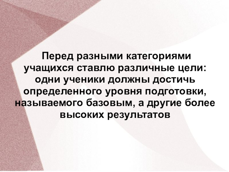 Перед разными категориями учащихся ставлю различные цели: одни ученики должны достичь определенного уровня подготовки, называемого базовым,