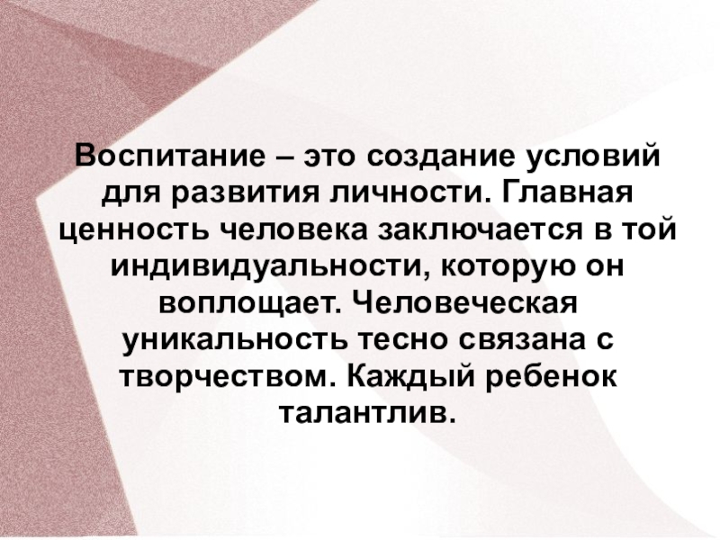 Воспитание – это создание условий для развития личности. Главная ценность человека заключается в той индивидуальности, которую он