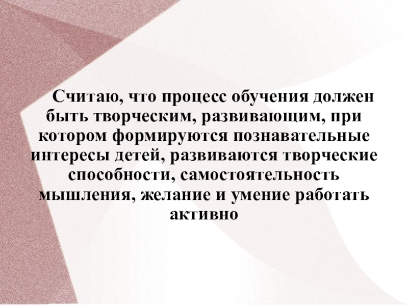 Считаю, что процесс обучения должен быть творческим, развивающим, при котором формируются познавательные интересы