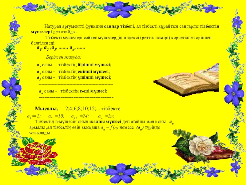 Тізбектің n-мүшесін оның жалпы мүшесі деп атайды және оны an арқылы ,ал тізбектің өзін қысқаша an = f (n) немесе (an) түрінде жазылады