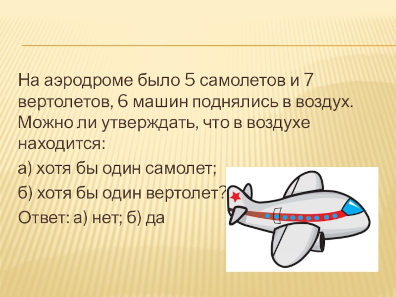 Слайд 17На аэродроме было 5 самолетов и 7 вертолетов, 6 машин поднялись