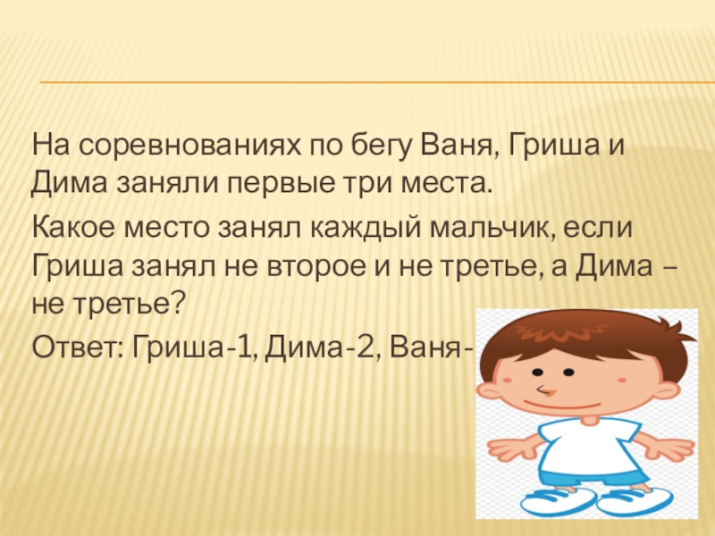 Слайд 22На соревнованиях по бегу Ваня, Гриша и Дима заняли первые три