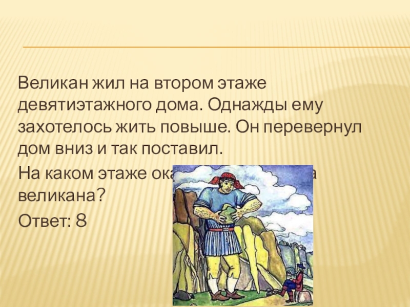 Слайд 34Великан жил на втором этаже девятиэтажного дома. Однажды ему захотелось жить