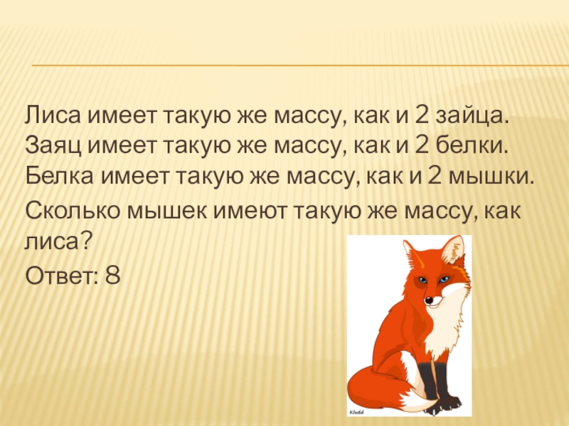 Слайд 32Лиса имеет такую же массу, как и 2 зайца. Заяц имеет