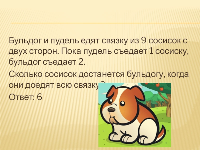 Слайд 31Бульдог и пудель едят связку из 9 сосисок с двух сторон.