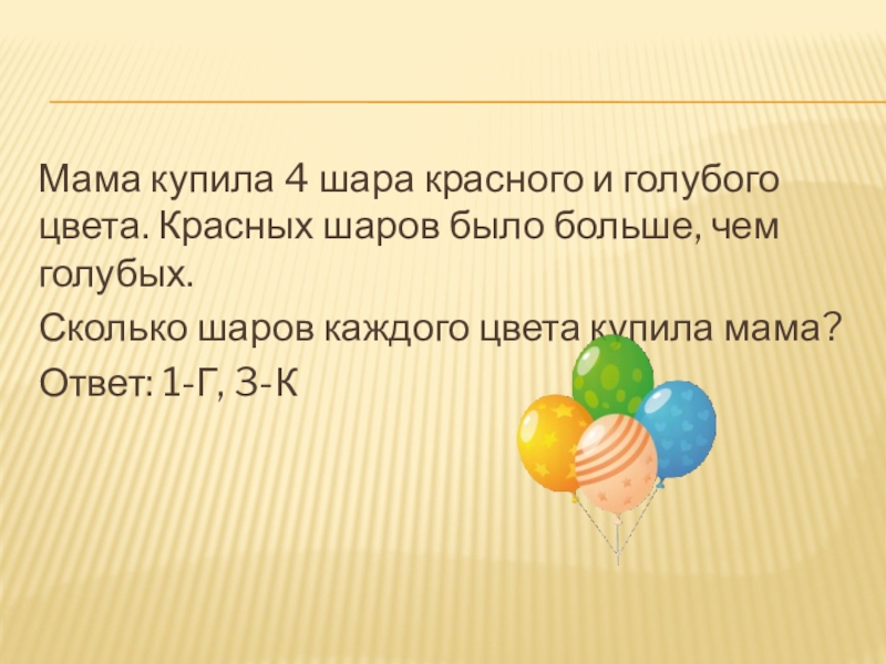 Слайд 30Мама купила 4 шара красного и голубого цвета. Красных шаров было