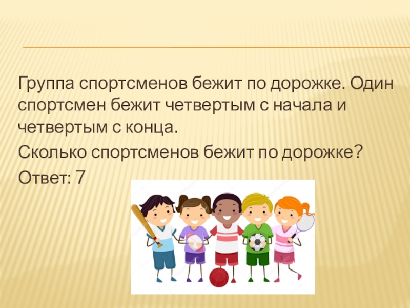Слайд 26Группа спортсменов бежит по дорожке. Один спортсмен бежит четвертым с начала