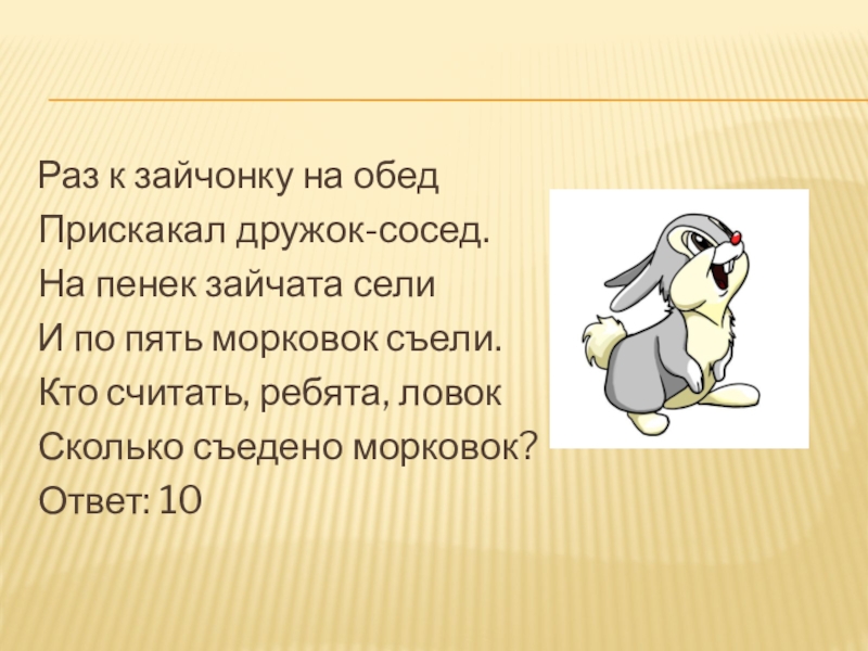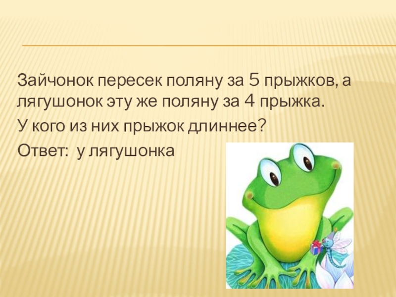 Слайд 28Зайчонок пересек поляну за 5 прыжков, а лягушонок эту же поляну