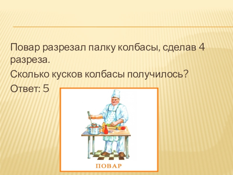 Слайд 29Повар разрезал палку колбасы, сделав 4 разреза.