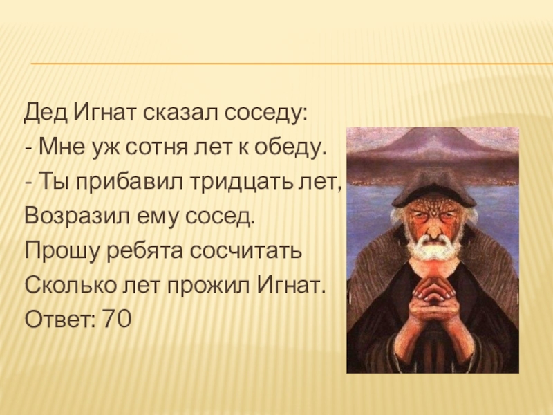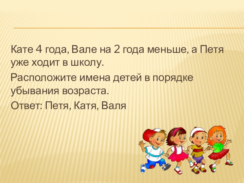 Слайд 18Кате 4 года, Вале на 2 года меньше, а Петя уже
