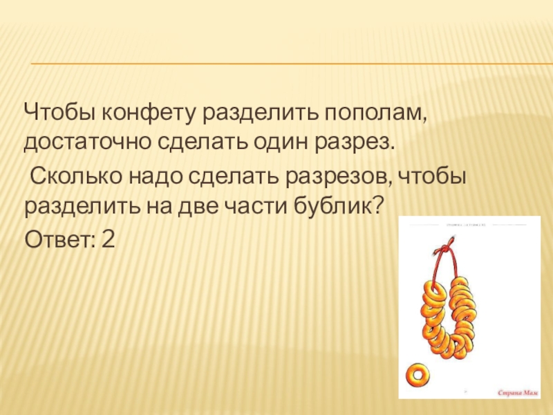 Слайд 20Чтобы конфету разделить пополам, достаточно сделать один разрез.