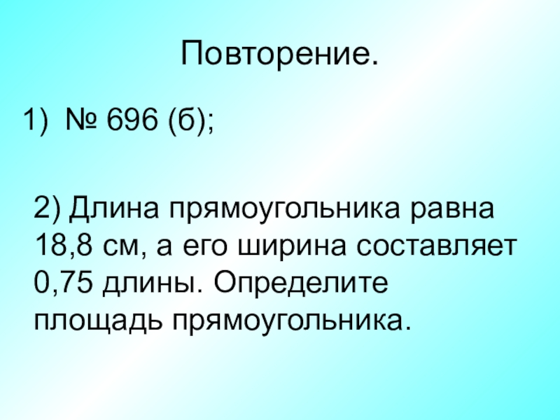 Повторение.№ 696 (б);2) Длина прямоугольника равна 18,8 см, а его ширина составляет 0,75 длины. Определите площадь прямоугольника.
