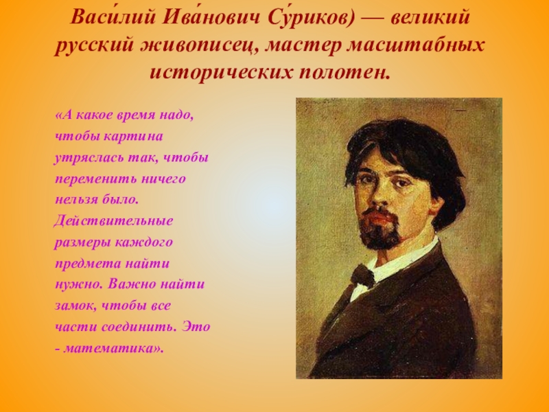 Васи́лий Ива́нович Су́риков) — великий русский живописец, мастер масштабных исторических полотен.
