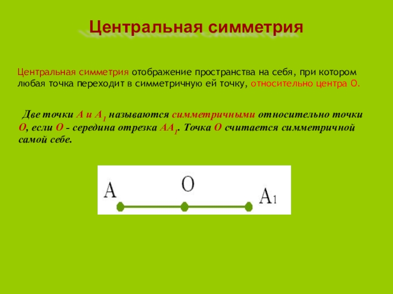 Центральная симметрия отображение пространства на себя, при котором любая точка переходит в симметричную ей точку, относительно центра О.