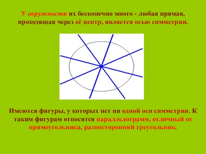У окружности их бесконечно много - любая прямая, проходящая через её центр, является осью симметрии.