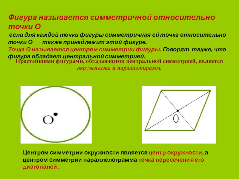 Простейшими фигурами, обладающими центральной симметрией, является окружность и параллелограмм.
