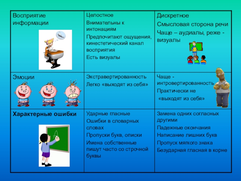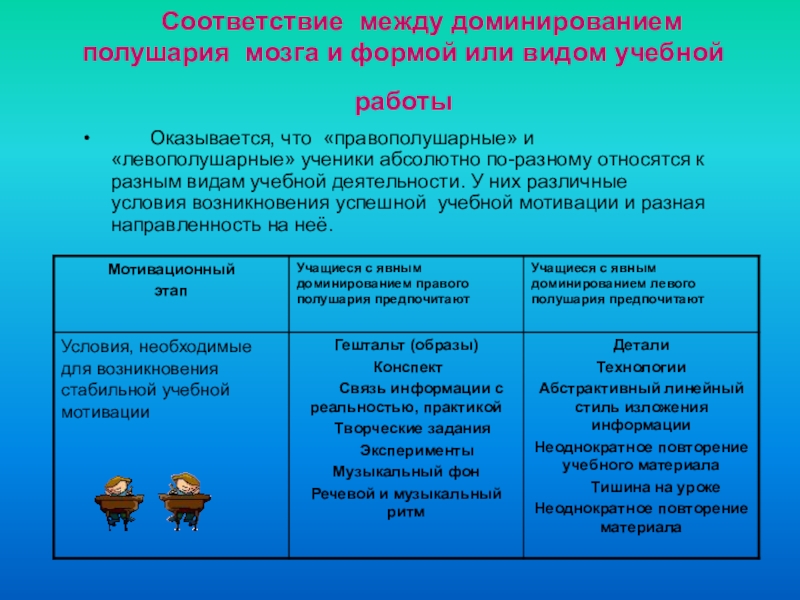 Оказывается, что «правополушарные» и «левополушарные» ученики абсолютно по-разному относятся к разным видам учебной деятельности. У них различные условия возникновения успешной учебной мотивации и разная направленность на неё.