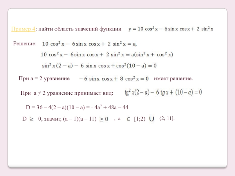 D = 36 – 4(2 – a)(10 – a) = - 4a2 + 48a – 44