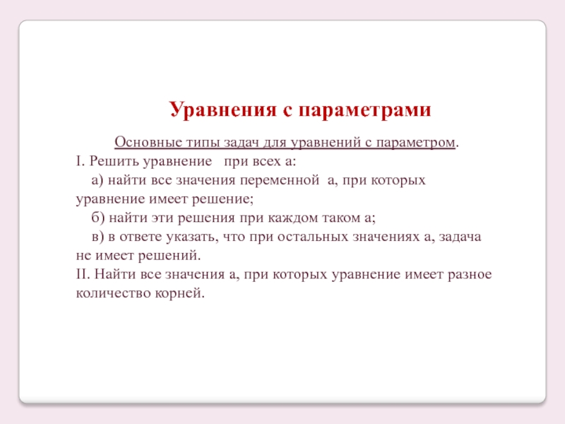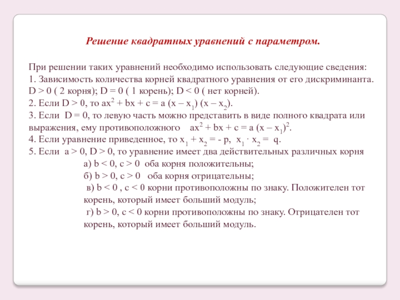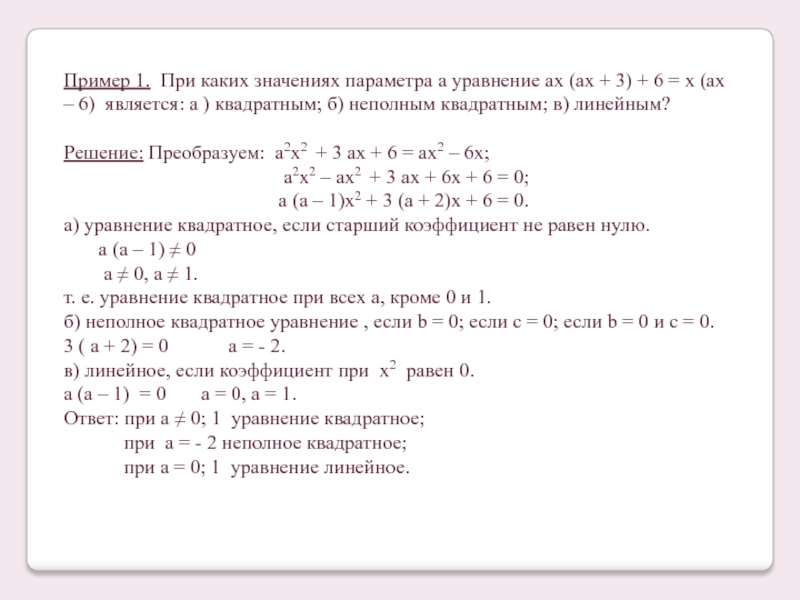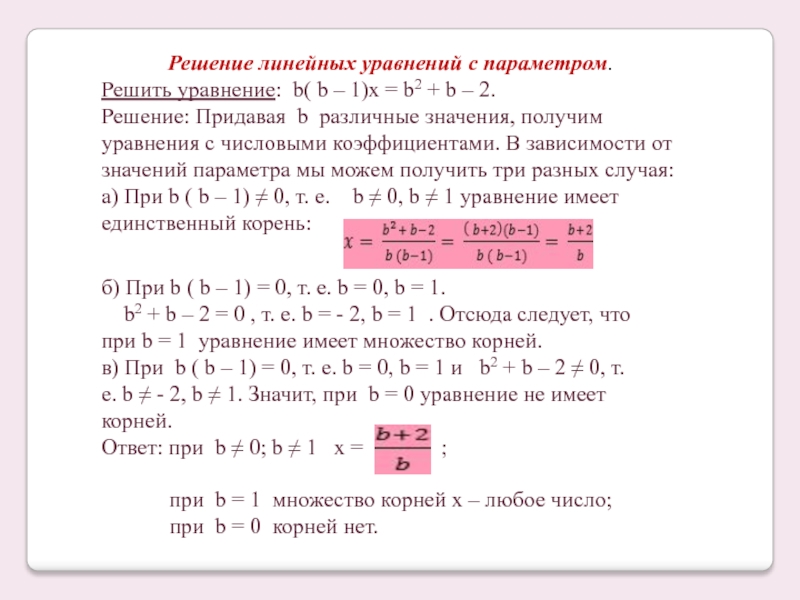 Решение: Придавая b различные значения, получим уравнения с числовыми коэффициентами. В зависимости от значений параметра мы можем получить три разных случая: