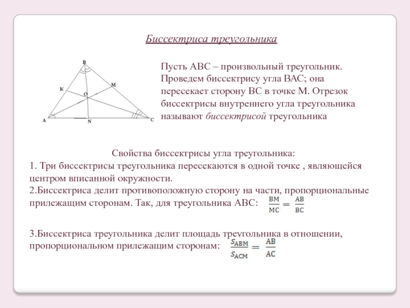 1. Три биссектрисы треугольника пересекаются в одной точке , являющейся центром вписанной окружности.
