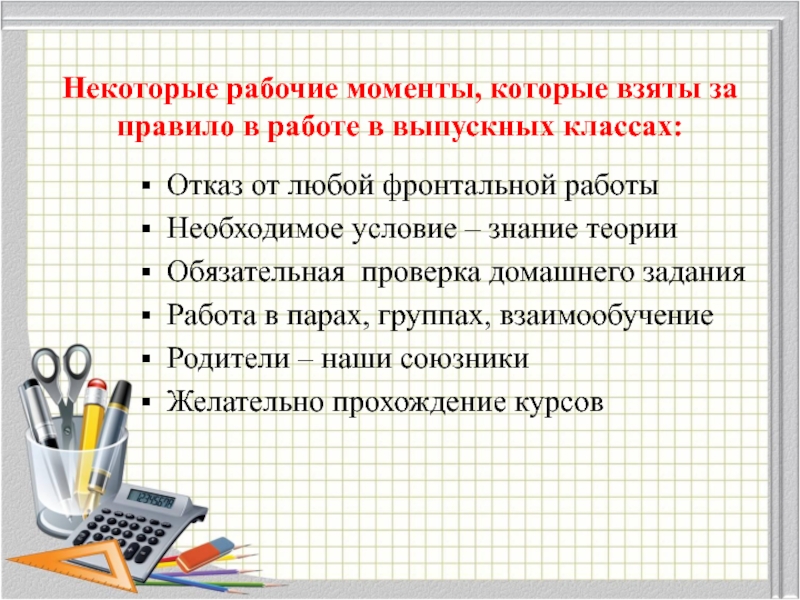 Некоторые рабочие моменты, которые взяты за правило в работе в выпускных классах: