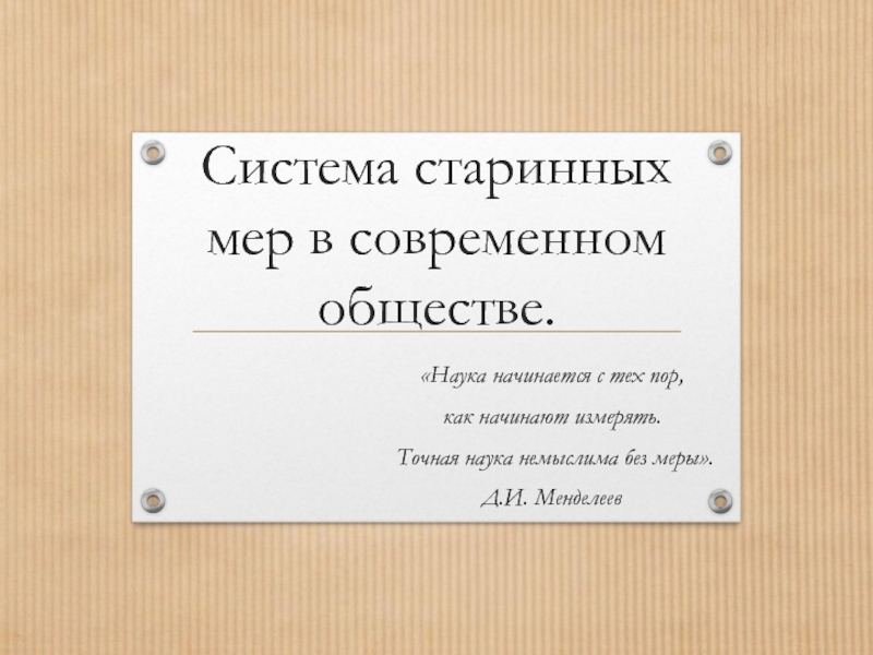 Система старинных мер в современном обществе.«Наука начинается с тех пор, как начинают измерять. Точная наука немыслима без меры».Д.И. Менделеев