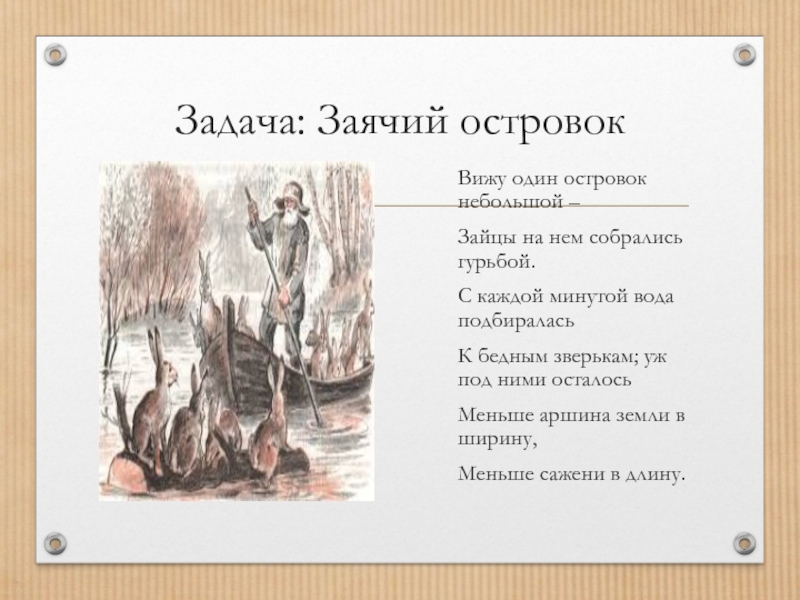 Задача: Заячий островокВижу один островок небольшой –Зайцы на нем собрались гурьбой.С каждой минутой вода подбираласьК бедным зверькам;