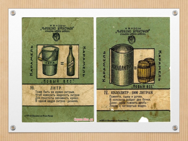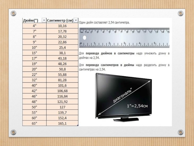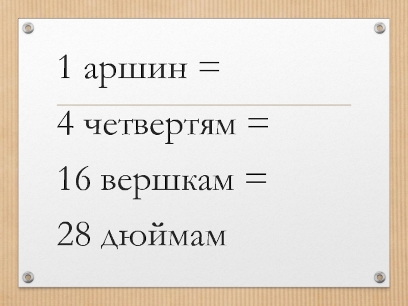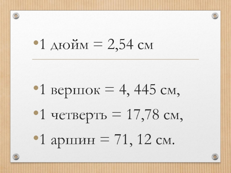 1 дюйм = 2,54 см1 вершок = 4, 445 см, 1 четверть = 17,78 см, 1 аршин