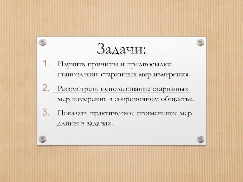 Задачи:Изучить причины и предпосылки становления старинных мер измерения.Рассмотреть использование старинных мер измерения в современном обществе.Показать практическое применение