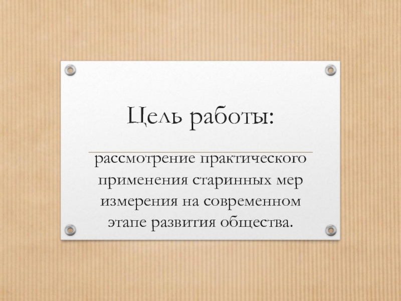 Цель работы:рассмотрение практического применения старинных мер измерения на современном этапе развития общества.