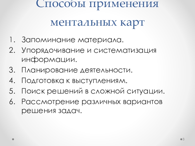 Способы применения ментальных картЗапоминание материала.Упорядочивание и систематизация информации.Планирование деятельности.Подготовка к выступлениям.Поиск решений в сложной ситуации.Рассмотрение различных вариантов