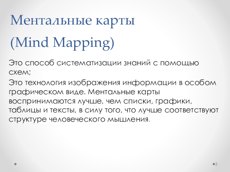 изображения информации в особом графическом виде. Ментальные карты воспринимаются лучше, чем списки, графики, таблицы и тексты, в силу того, что лучше соответствуют структуре человеческого мышления.