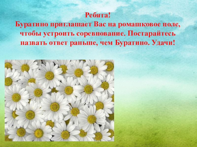 Ребята!Буратино приглашает Вас на ромашковое поле, чтобы устроить соревнование. Постарайтесь назвать ответ раньше, чем Буратино. Удачи!