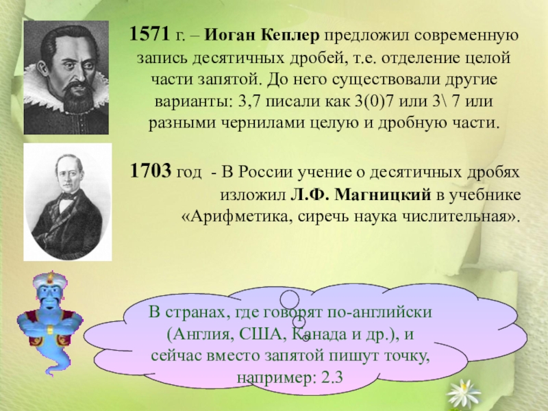 1703 год - В России учение о десятичных дробях изложил Л.Ф. Магницкий в учебнике
