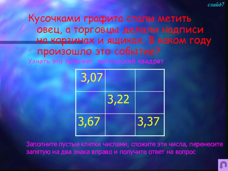 Заполните пустые клетки числами, сложите эти числа, перенесите запятую на два знака вправо и получите ответ на вопрос