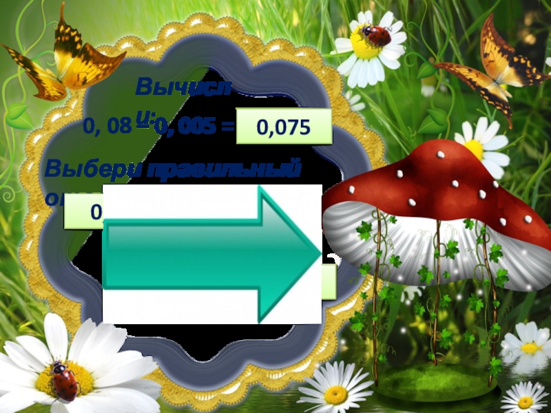 Вычисли:0, 08 – 0, 005 = ?Выбери правильный ответ:0,0750,030,0750,750,003