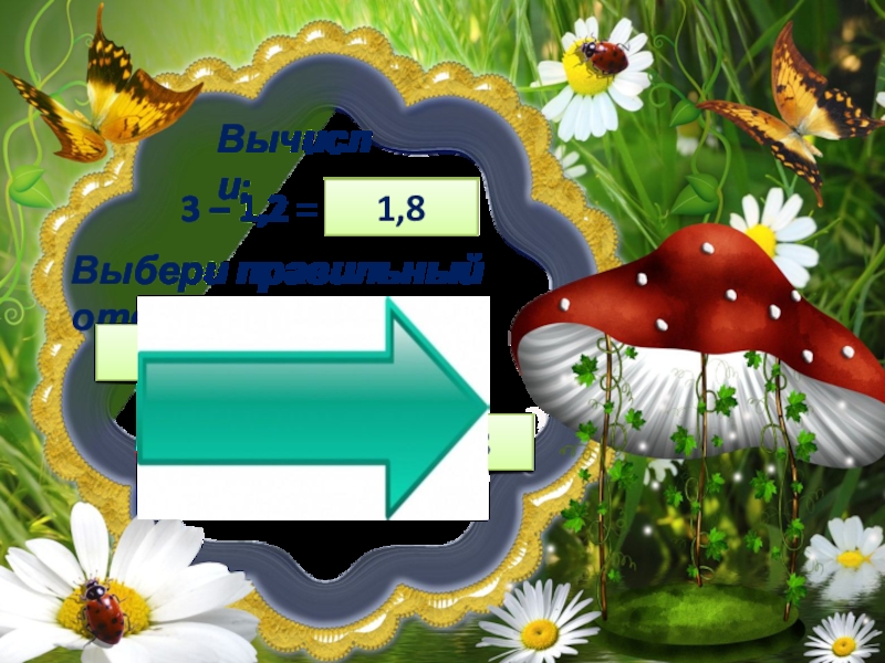 Вычисли:3 – 1,2 = ?Выбери правильный ответ:1,8181,81,08180