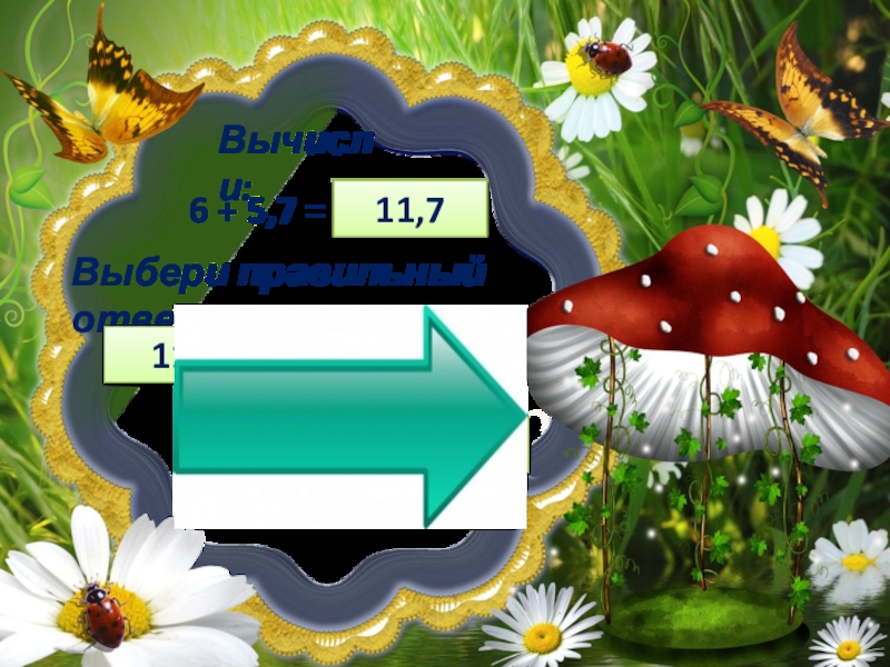 Вычисли:6 + 5,7 = ?Выбери правильный ответ:11,70,11711,71171,17
