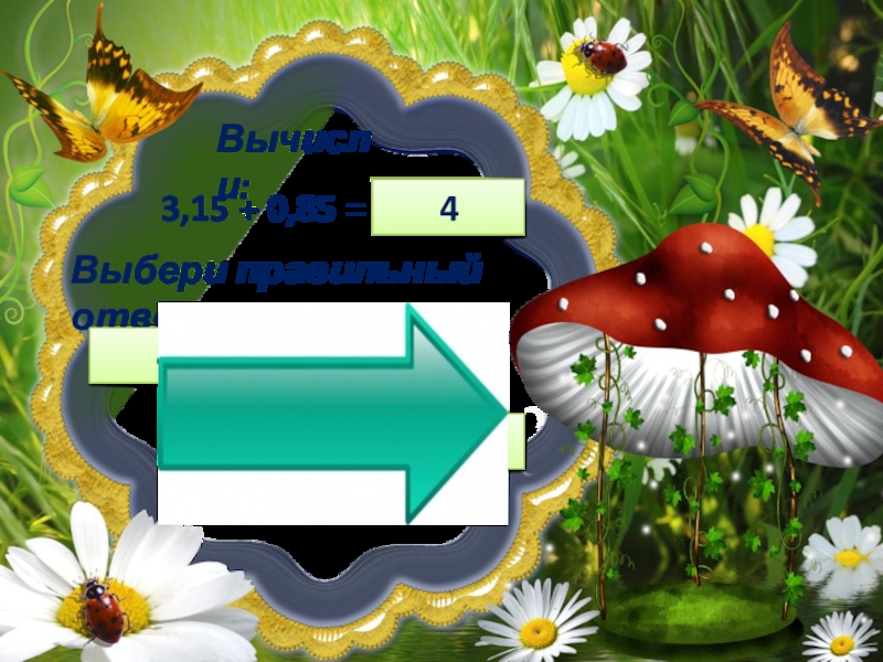 Вычисли:3,15 + 0,85 = ?Выбери правильный ответ:43,00143,13,01