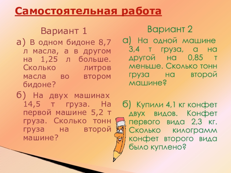 а) На одной машине 3,4 т груза, а на другой на 0,85 т меньше. Сколько тонн груза на второй машине?