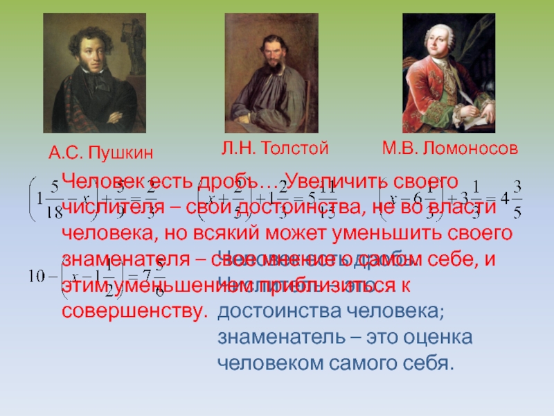 Человек есть дробь… Увеличить своего числителя – свои достоинства, не во власти человека, но всякий может уменьшить своего знаменателя – свое мнение о самом себе, и этим уменьшением приблизиться к совершенству.