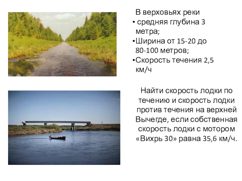 Собственная скорость теплохода «Заря» 43 км/ч. Скорость теплохода от Сойги до Котласа равна 44,6 км/ч. Найдите скорость течения реки и скорость теплохода от Котласа до Сойги.