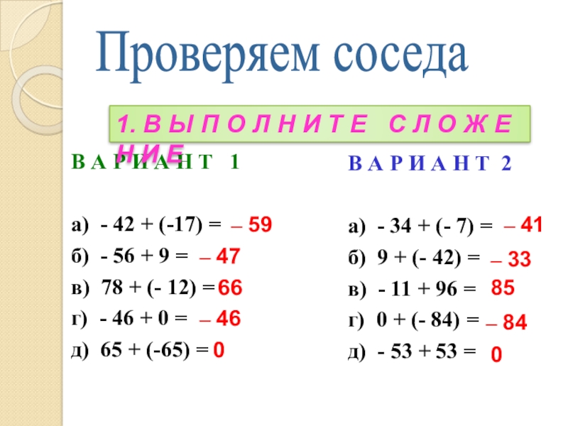 г) 0 + (- 84) =