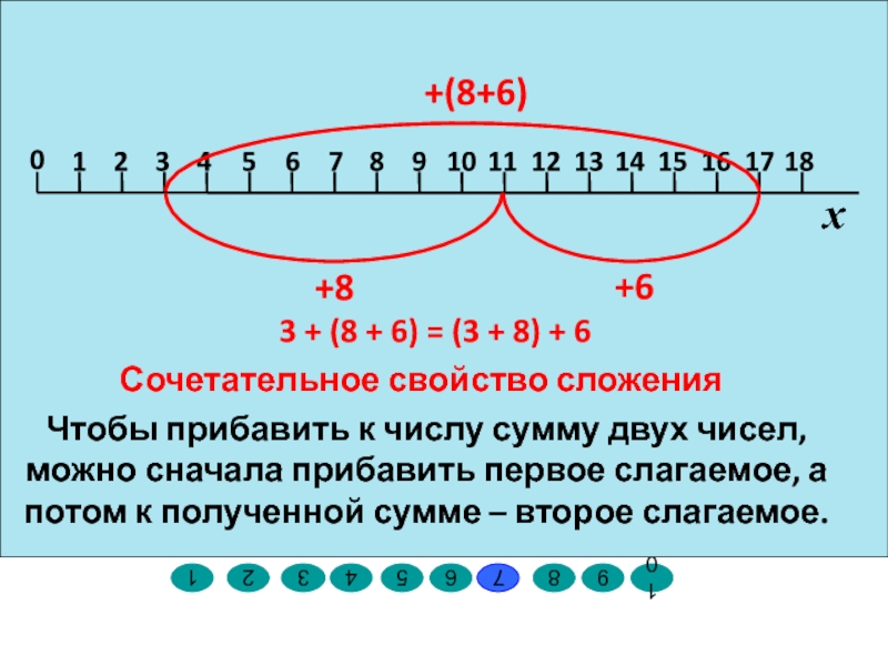 Чтобы прибавить к числу сумму двух чисел, можно сначала прибавить первое слагаемое, а потом к полученной сумме – второе слагаемое.