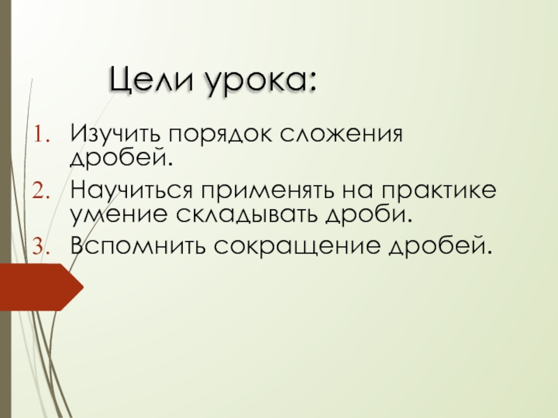 Цели урока:Изучить порядок сложения дробей.Научиться применять на практике умение складывать дроби.Вспомнить сокращение дробей.