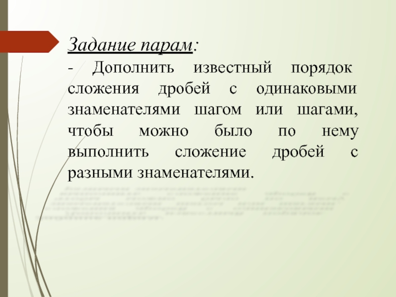 Задание парам: - Дополнить известный порядок сложения дробей с одинаковыми знаменателями шагом или шагами, чтобы можно было