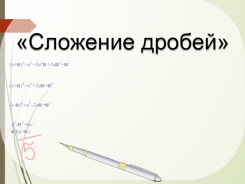 a2-в2=(a-в)(a+в)(a-в)2=a2-2aв+в2(a+в)2=a2+2aв+в2(a+в)3=a3+3a2в+3aв2+в3«Сложение дробей»